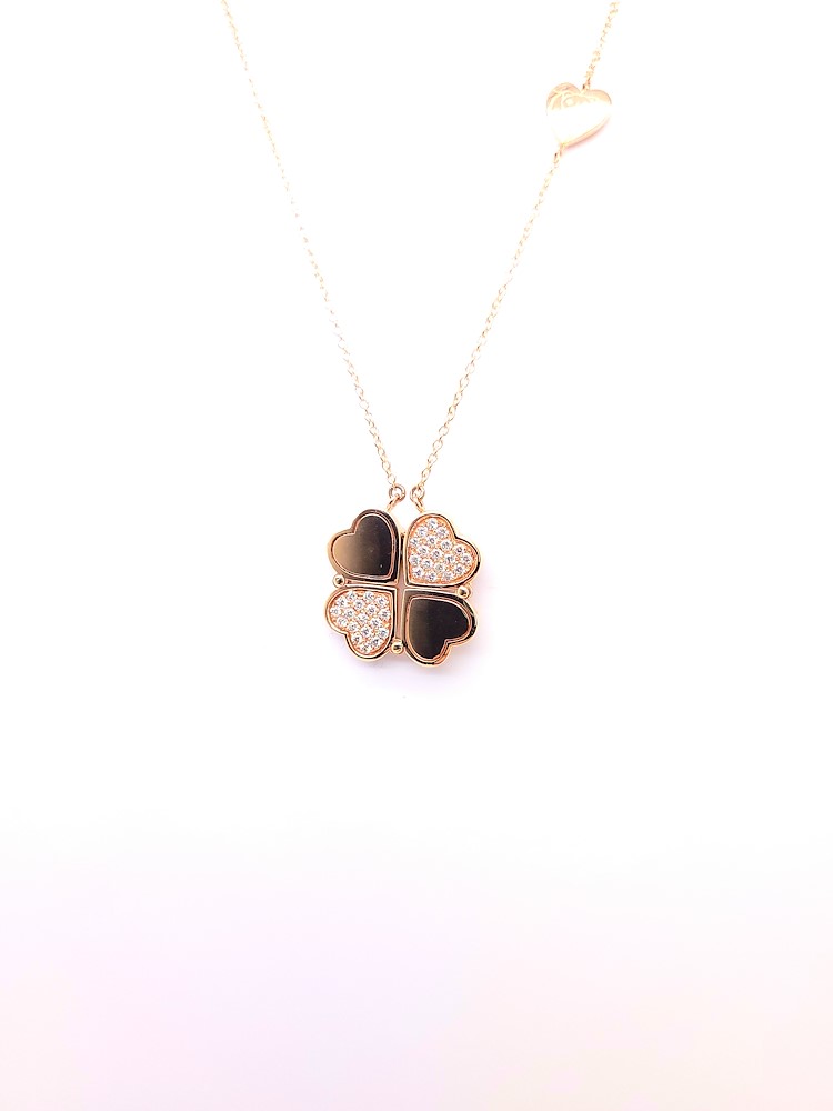 Il girocollo è regolabile su due lunghezze fino ad un massimo di 45 cm ed il ciondolo si apre trasformando il quadrifoglio in un centrale di cuori