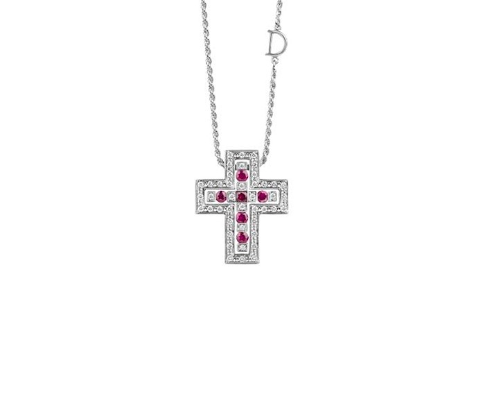 Collana Damiani collezione Belle Epoque con croce pendente in oro bianco e diamanti taglio brillante e rubini per una caratura totale di 0.29 Kt