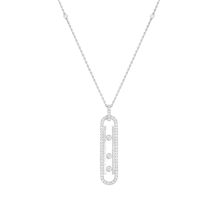 Lo adoriamo veramente, follemente, profondamente... Questa è una storia d'amore che dura da più di un decennio. Il design Move ha incantato molte donne, diventando il capo che scelgono di indossare ogni giorno. La collana di diamanti in oro bianco Move 10th PM celebra gli elementi più potenti dell'iconica collezione di gioielli di lusso. Realizzati verticalmente, i diamanti mobili Move sembrano fluttuare, come per magia. Amerai la sua catena di diamanti scorrevole, che permette di indossare questa collana di diamanti da donna più corta o più lunga, come desideri. Un vero camaleonte, questa collana di diamanti in oro bianco aggiungerà il tocco perfetto a qualsiasi look, sia esso urban chic, glamour o casual. Amore a prima vista garantito!