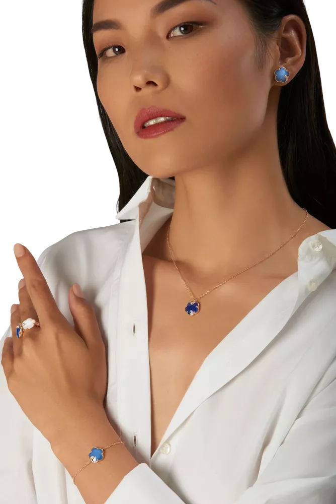La collezione Petit Joli celebra donne dallo spirito libero, con gioielli che uniscono forza e dolcezza attraverso i colori della natura. La collana in oro rosa 18 carati con doppietta di lapislazzuli e cristallo di rocca con diamanti cattura il blu intenso della pietra e le sue sfumature dorate, evocando il manto celeste degli dei e donando forza, sensualità e armonia a chi la indossa.