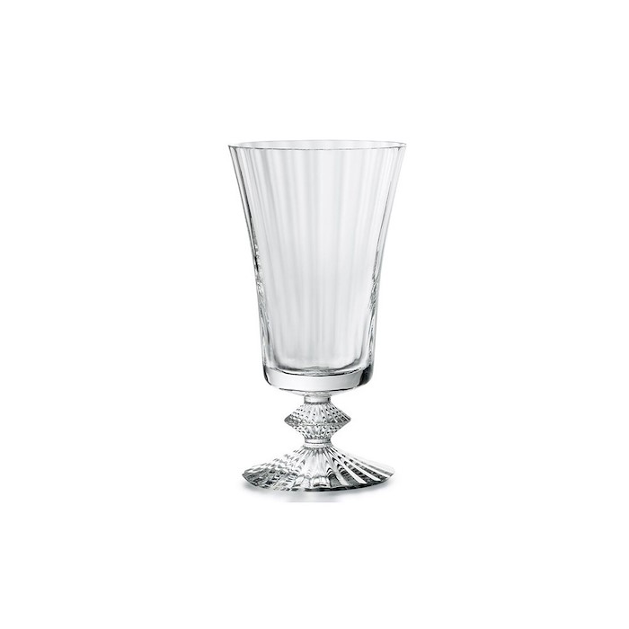 Baccarat Mille Nuits 3 goblet. Running vertically across the tall, slender cup, this pattern gracefully diffuses the light flowing from the silhouette. The striped pattern is also visible on the foot of the glass, where it radiates from the stem. The elegant central diamond-cut crystal shard is the distinctive element of the Mille Nuits chalices, placed between the base of the bowl and the foot of the glass to join the two sections. The Mille Nuits goblet is also available as champagne flà "te, produced in a wide range of vibrant colors. The Mille Nuits collection also includes items from the Tableware series, such as bottles and plates, and Home Décor, such as chandeliers, lamps, and candelabra.