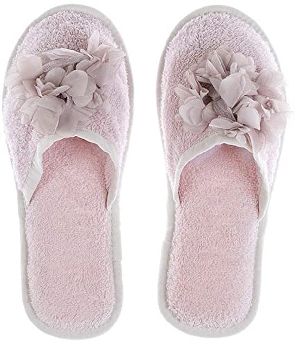 Ciabattine in spugna con applicazioni floreali in tessuto.