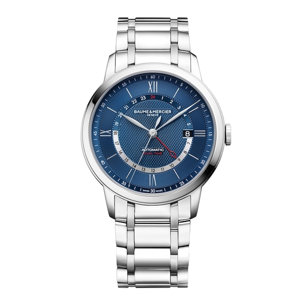 A Swiss automatic men's watch offered with a stainless steel bracelet with a polished finish to match the case, the Classima 10483 features a blue dial with grain d'orge guilloché decoration, Roman numerals, and dual time zone with central hand.