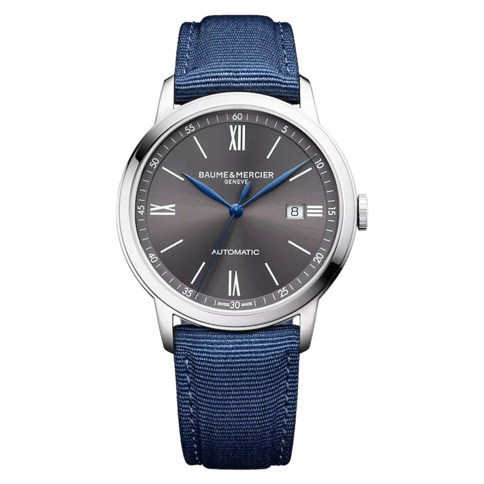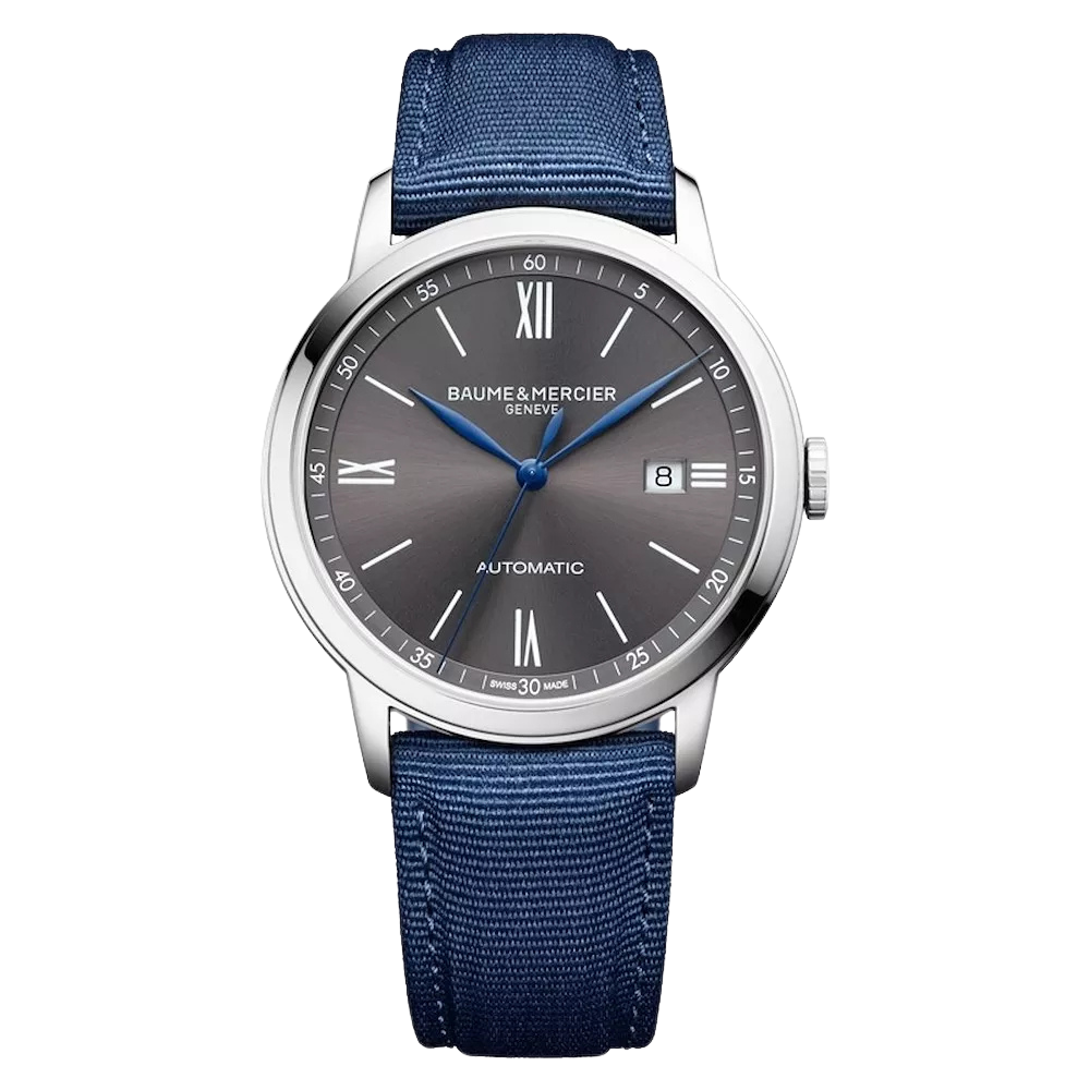 The Classima 10608 offers an ambitious luxury timepiece with a sophisticated and professional character, thanks to its slate gray dial and blue hands. It is accompanied by an interchangeable blue canvas strap that gives it a casual style that is also ideal for the weekend.