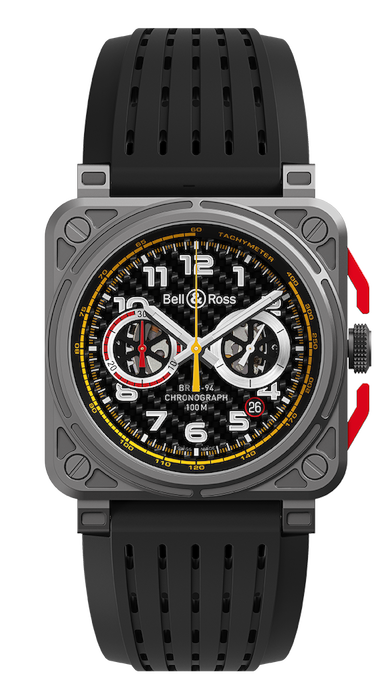 Quadrante: fibra di carbonio. Numeri di metallo applicati riempiti di Superluminova®. Lancette delle ore e dei minuti di metallo scheletrate riempite di Superluminova®.