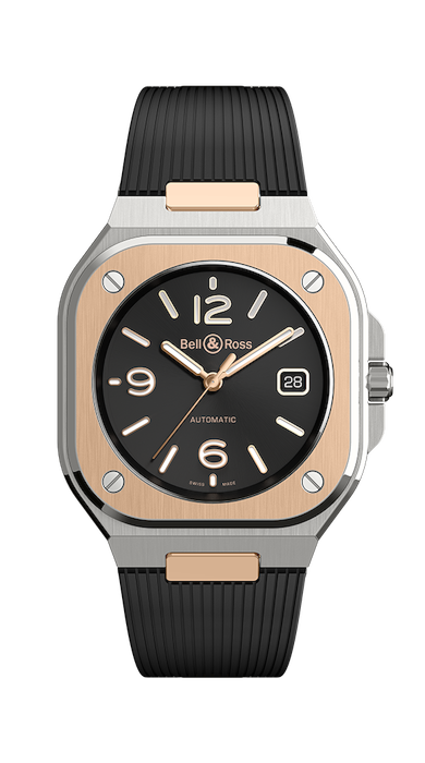 Con il suo look classico ed elegante, questa nuovo modello della collezione urban BR05 ci riporta allo spirito degli anni ’80 con lasua doppia tonalità. Quando un materiale tecnico incontra una sostanza preziosa il risultato è la combinazione tra acciaio lucido satinato e oro rosa 18 carati: una fusione di robustezza e sofisticazione. Caratterizzato dall’iconico grafismo del brand, il quadrante nero soleil contrasta perfettamente con i numeri, gli indici e le lancette scheletrate delle ore e dei minuti in oro rosa, riempite di Super-LumiNova® per una leggibilità ottimale.