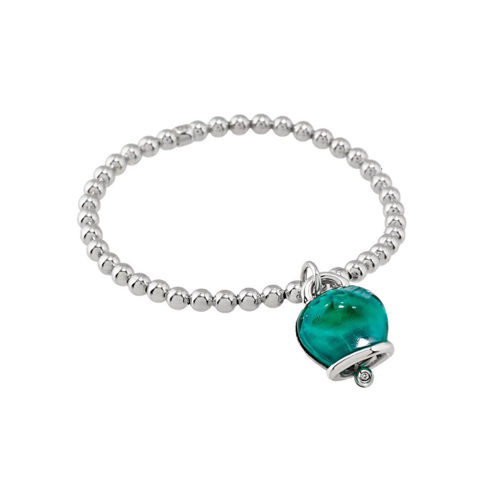 The Et Voilà Campanelle bracelet in silver is a refined elastic bracelet, adorned with a medium-sized Campanella charm crafted from hand-faceted Paraiba green resin and accented with a brilliant-cut diamond. Part of the Et Voilà collection, the Et Voilà Campanelle bracelet combines elegance and artisanal craftsmanship, resulting in a versatile and contemporary jewel. The composition includes 10 grams of silver, 0.90 grams of resin, and a 0.01-carat diamond.