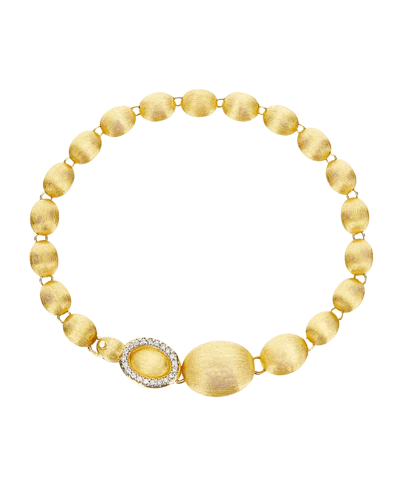 The Ivy bracelet in 18 kt gold, hand-engraved and set with diamonds, is one of Nanis’s most iconic designs. The gold beads, crafted with meticulous attention to detail to achieve a light, silky texture, are paired with a diamond clasp that can also be attached to the Ivy necklace for a unique look. The diamonds have a total weight of 0.25 ct, clarity VS, colour G and round brilliant cut.