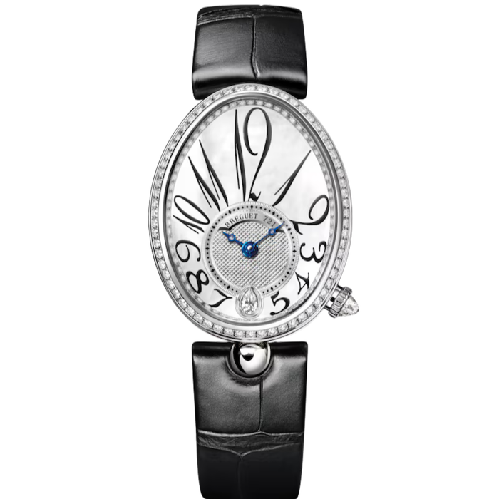 Reine de Naples wristwatch in 18-carat gold. Bezel, dial flange and crown set with 118 diamonds, approx. 1.15ct. Off-centred chapter ring with Breguet Arabic numerals. Self-winding movement. Balance spring, lever and escape wheel in silicon. Sapphire caseback. Water-resistant to 3 bar (30m). Dimensions: 36.5 x 28.45mm.