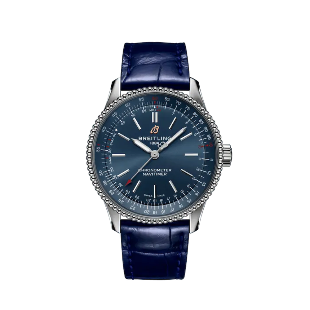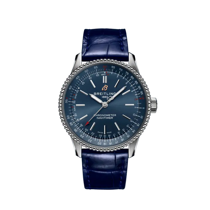 Refined and elegant, the Navitimer Automatic 35 combines the historic appeal of a true icon with the sophistication of a sophisticated contemporary timepiece. Available in a variety of materials including stainless steel and 18K red gold, the 35mm case features a drop-shaped bezel and a range of elegant dial colors, as well as a white mother-of-pearl version set with diamonds. Offered with a matching bracelet or crocodile leather strap that can be paired with a stainless steel pin buckle or deployant, the Navitimer Automatic 35 is powered by Breitling Caliber 17, a COSC-certified chronometer.