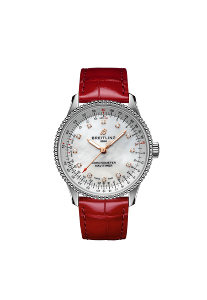 Raffinato ed elegante, il Navitimer Automatic 35 coniuga il fascino storico di una vera icona con la raffinatezza di un sofisticato segnatempo contemporaneo. Disponibile in diversi materiali tra cui l’acciaio inossidabile e l’oro rosso 18 carati, la cassa da 35 mm presenta una lunetta a gocce e una gamma di eleganti colori del quadrante, nonché la versione in madreperla bianca con diamanti incastonati. Proposto con un bracciale abbinato o un cinturino in pelle di coccodrillo abbinabile a una fibbia ad ardiglione o deployante in acciaio inossidabile, il Navitimer Automatic 35 è azionato dal Calibro Breitling 17, cronometro certificato COSC.