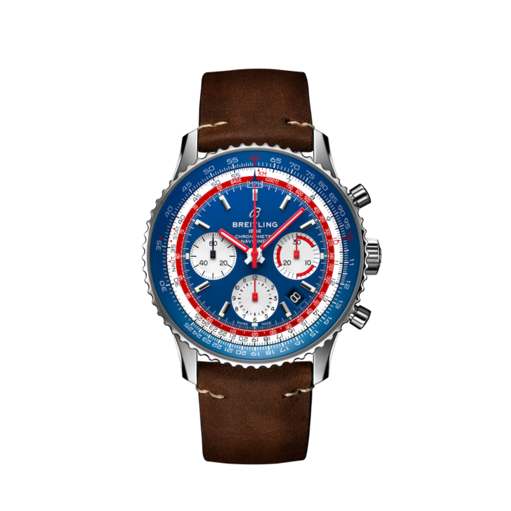 Il Navitimer 1 B01 Chronograph 43 Pan Am Edition si distingue per uno dei loghi più riconoscibili nella storia dell’aviazione sul fondo trasparente in vetro zaffiro. Per decenni, la Pan American World Airways è stata una forza dominante nell’aviazione commerciale e il suo nome è ancora strettamente legato all’emozione dei viaggi aerei. La Pan Am Edition si presenta con una cassa in acciaio inossidabile e uno splendido quadrante blu con contatori argento a contrasto e sfoggia un bracciale in maglia di acciaio inossidabile. Il suo movimento cronografico meccanico di manifattura offre una precisione straordinaria e una riserva di carica di circa 70 ore. Questo modello è disponibile anche con bracciale Air Racer o cinturino in pelle marrone di ispirazione vintage con fibbia ad ardiglione o fibbia deployante.