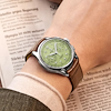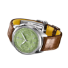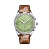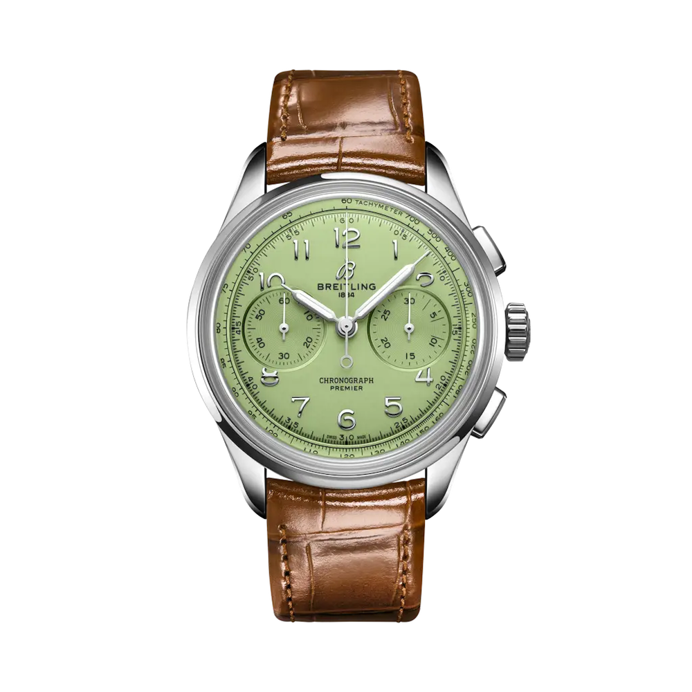 A tribute to three generations of inventors-Léon, Gaston, and Willy Breitling-the Premier Chronograph embodies the Breitling heritage that led to the invention of the modern chronograph. As Willy Breitling said, the Premier is an “unmistakable sign of impeccable taste.” This latest generation of Premier Chronographs-the Chronograph, the Duograph, and the Datora-relaunches its timeless elegance and demonstrates Breitling's high watchmaking standards through a range of iconic Premier complications. With rectangular chronograph pushers, the look of a bi-compax chronograph, and Arabic numerals, the Premier Chronographs in homage to tradition display a variety of elegant design details such as grooves on the sides of the case, open sapphire crystal casebacks, and vintage-inspired hands. The Chronograph comes in two variants: stainless steel with a pistachio green dial and golden brown crocodile leather strap or 18K red gold with a silver dial and brown crocodile leather strap. The model is powered by Breitling's in-house hand-wound COSC-certified Caliber B09.