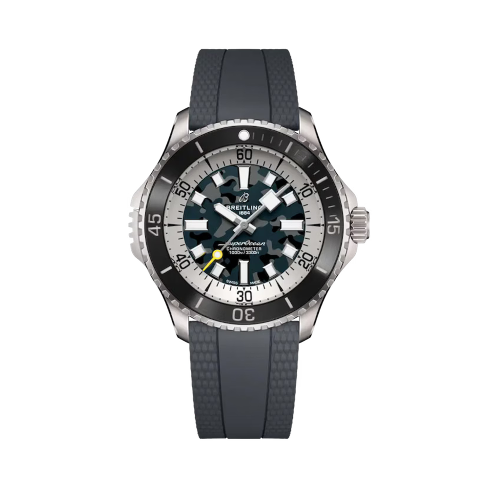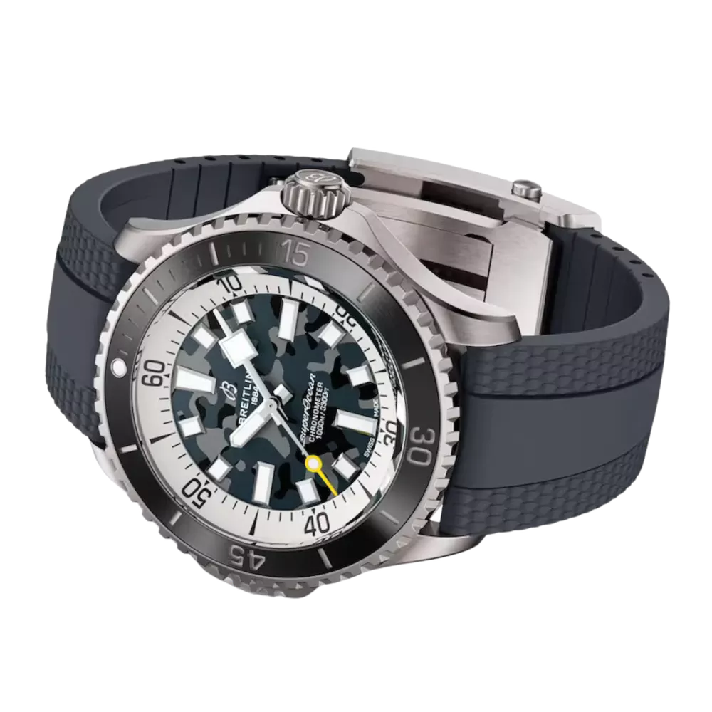 Super performance for all your water-based pursuits. In the 1960s, the new sport of scuba diving was all the rage. For divers, timing was everything, and Breitling set out to give them the most clear-cut dive watch possible by eliminating any feature that didn’t support their lifesaving needs underwater. This pared-down watch was named the Superocean Slow Motion. What remained were clean lines, chunky luminescent indexes, squared-off hands and a high-contrast dial ring, all aimed at maximum legibility. Practical, yes. But what people really fell in love with was the look. The Superocean Automatic 46 Super Diver retraces the Slow Motion's celebrated design codes, while adding modern features, like a scratch-proof matt ceramic-inlayed bezel and camouflage dials. Broad hands and indexes in luminescent Super-LumiNova® allow for easy readability underwater. The watch is water resistant to 1,000 m (3,300 ft), as well as being shock-, sand- and saltwater-resistant. And there’s much more to this watch than meets the eye: Its soft-iron inner case offers protection against the effects of magnetic fields, while its bi-directional rotating bezel can be safely secured with a lock on the left side of the case. The two strap options (rubber or titanium bracelet) have a folding clasp that allows for micro-adjustments of up to 15 mm for easy wear over rashies and wetsuits. Best of all, this is no longer strictly a dive watch—surf with it, swim with it, hit the beach bar with it, then wear it out to dinner. The Superocean perfectly balances the nostalgia of its heritage with a fresh new look.
