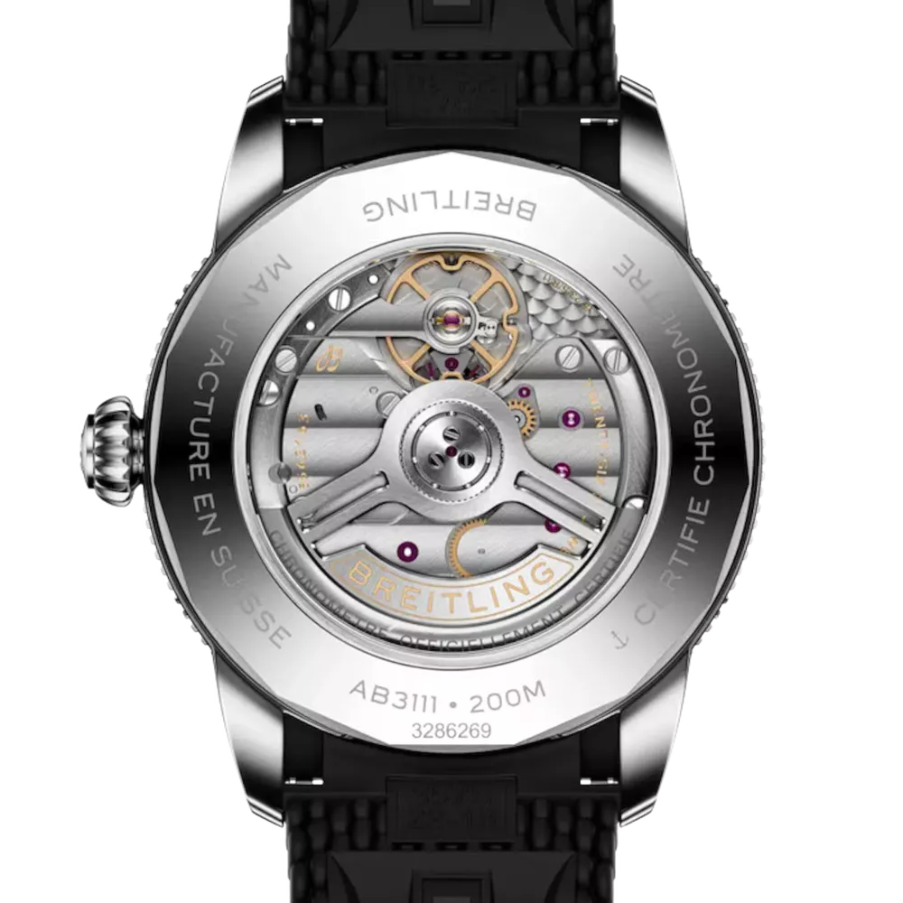 Mechanical self-winding movement with in-house Breitling B31 caliber, approximately 78-hour power reserve, frequency of 28,800 vibrations per hour, date display through an aperture on the dial; stainless steel case with screwed sapphire crystal case back, water resistance up to 200 meters, unidirectional bezel with stop function, screw-locked crown with double gasket, cambered sapphire crystal with anti-reflective coating on both sides; 42 mm diameter, 22.05 mm lug width, total weight approximately 109.67 g (watch head approximately 70 g); straight black rubber strap with 22/18 mm lugs, folding clasp in stainless steel measuring 18 mm; also available in other versions.