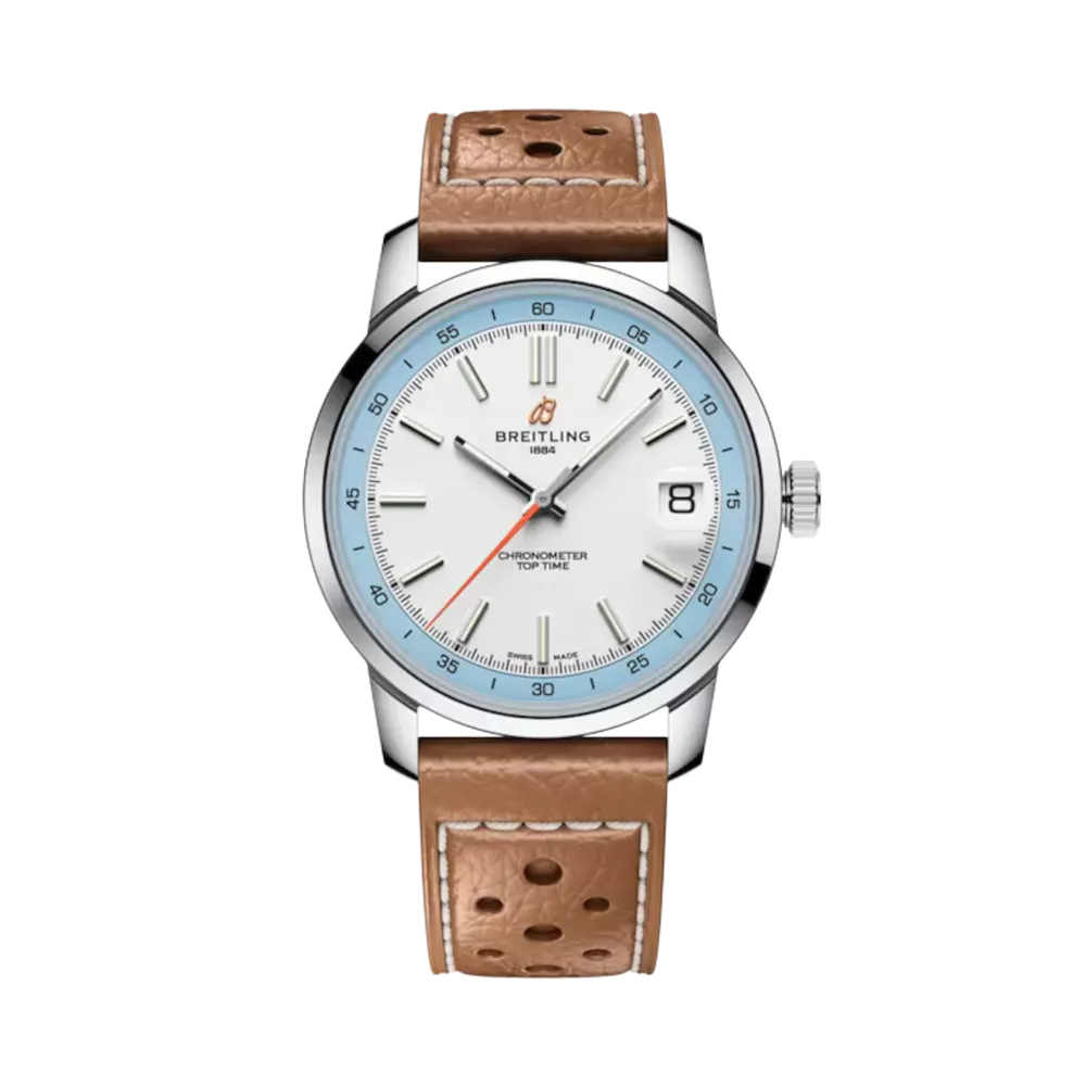 The Breitling Top Time B31 features a 38 mm stainless steel case with a screw-down back and sapphire crystal, offering water resistance up to 10 bar. It is powered by the in-house Breitling B31 calibre, a self-winding mechanical movement with a power reserve of approximately 78 hours, a frequency of 28,800 vph, and a date window display. The domed sapphire crystal is anti-reflective on both sides. The watch weighs approximately 65.84 g (head 54 g). It comes with a beige calfskin leather strap, 20/18 mm lug width, and an 18 mm stainless steel pin buckle.