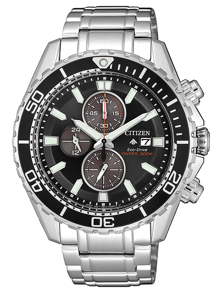Eco Drive a carica luce con riserva di carica di 180 giorni. Cronografo a 1/5 di sec