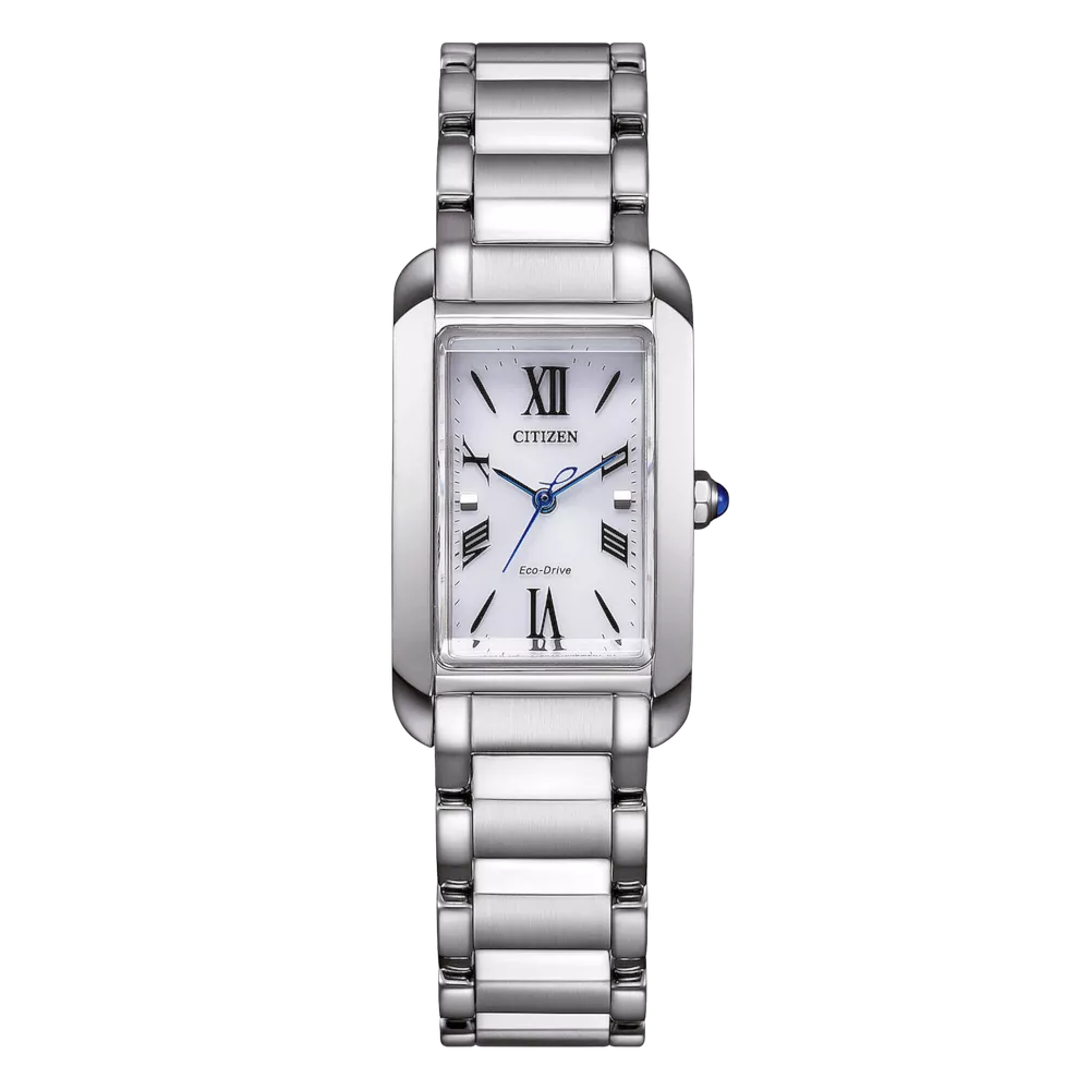 The Citizen EW5620-55A is a three-hand watch powered by light with an Eco-Drive movement and a 180-day power reserve. It features a rectangular stainless steel case measuring 32.5 x 19.5 mm, sapphire crystal, and a white analog dial. Complete with a stainless steel bracelet and deployant clasp, water-resistant up to 5 bar. Elegant, slim, and lightweight, it weighs 68 g. Item code: EW5620-55A.