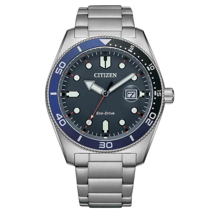 Men's Eco Drive watch by Citizen from the MARINE 1760 collection. The Eco Drive modelpresents a 43mm stainless steel case and a steel strap with safety clasp and pushers. The blue-colored dial features silver-contoured indexes and hands with luminescent beige inside them ensuring excellent readability even in dimly lit environments differentiating from the orange color of the seconds hand. Next there is a practical date window positioned at 3 o'clock, all protected by a mineral crystal with its respective unidirectional rotating bezel in blue and black aluminum. The watch is powered by a solar-powered eco drive movement, clamped in a screw-down case back, with a power reserve of 240 days and 10 bar water resistance supported by the screw-down crown. The item will be shipped with original Citizen box and 5-year warranty certificate, valid at any authorized service center.