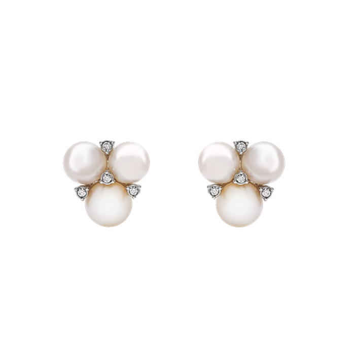 Cherie stud earrings in 18Kt white gold, diamonds, and freshwater pearls.