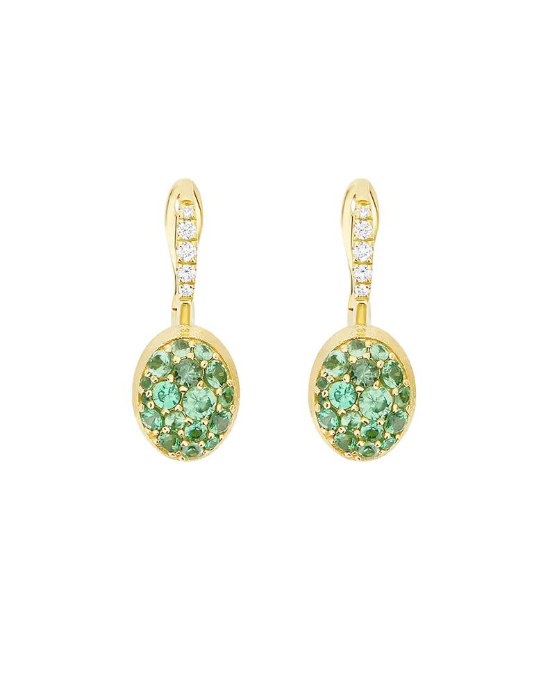 Small Lattementa Boules Cherry Earrings in engraved yellow gold, set with round brilliant-cut diamonds totalling 0.09 ct (clarity VS, colour G) and pavé-set tsavorites totalling 1.09 ct; dimensions: 8.2 x 21.2 mm.