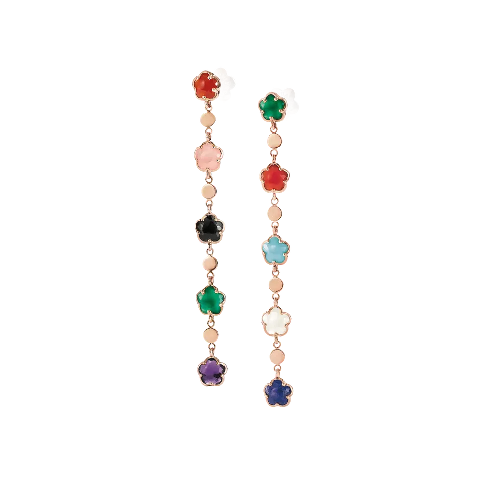 18K Rose Gold Earrings with White Diamonds: 0.01 ct. Green agate, red carnelian, onyx, white moonstone, pink chalcedony, amethyst, lapis lazuli, and turquoise. Flower size: 5 mmnull
