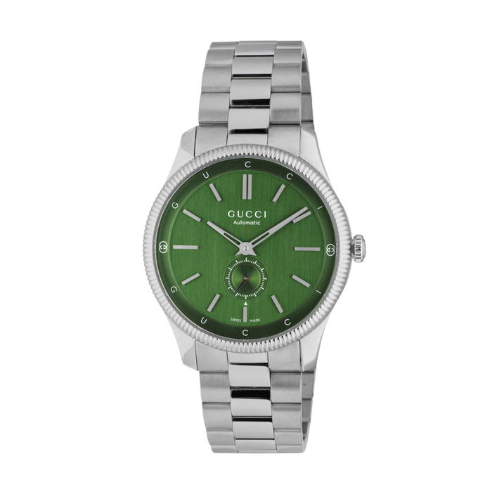 The Gucci G-Timeless Automatic blends classic elegance with contemporary design, showcasing the Maison’s signature style. This sophisticated timepiece features a 40 mm stainless steel case, a green brass dial with a small seconds display, and a matching stainless steel bracelet.