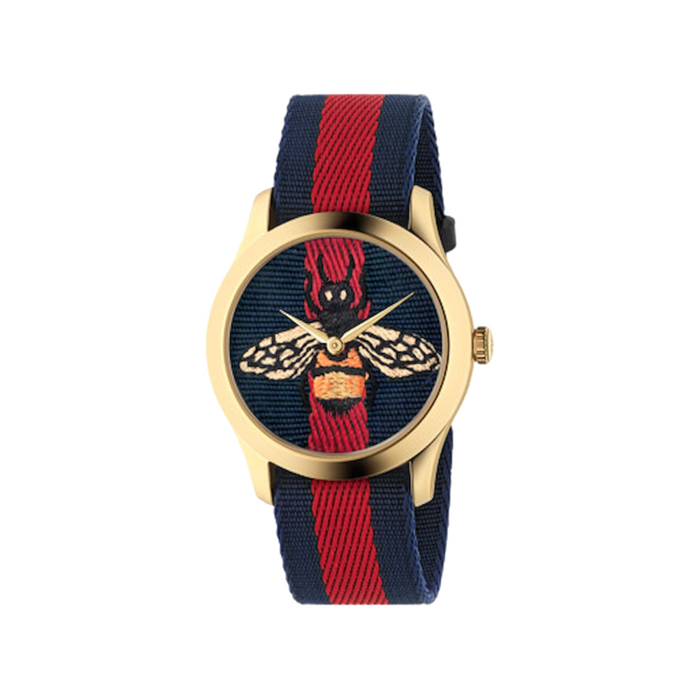 Yellow gold PVD case, blue-red-blue web dial with bee embroidery, blue-red-blue web nylon strap.