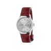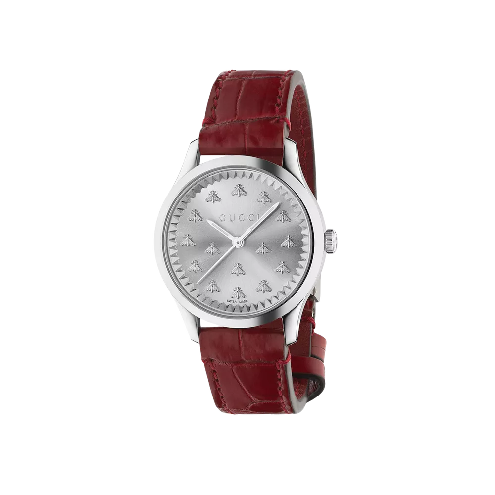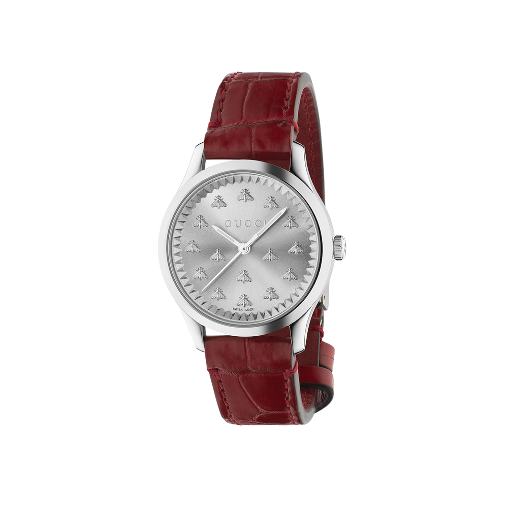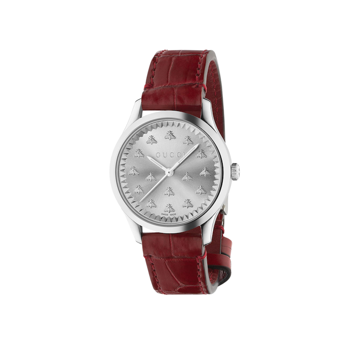 32mm steel case, silver sunbrushed dial with bees, red alligator leather bracelet