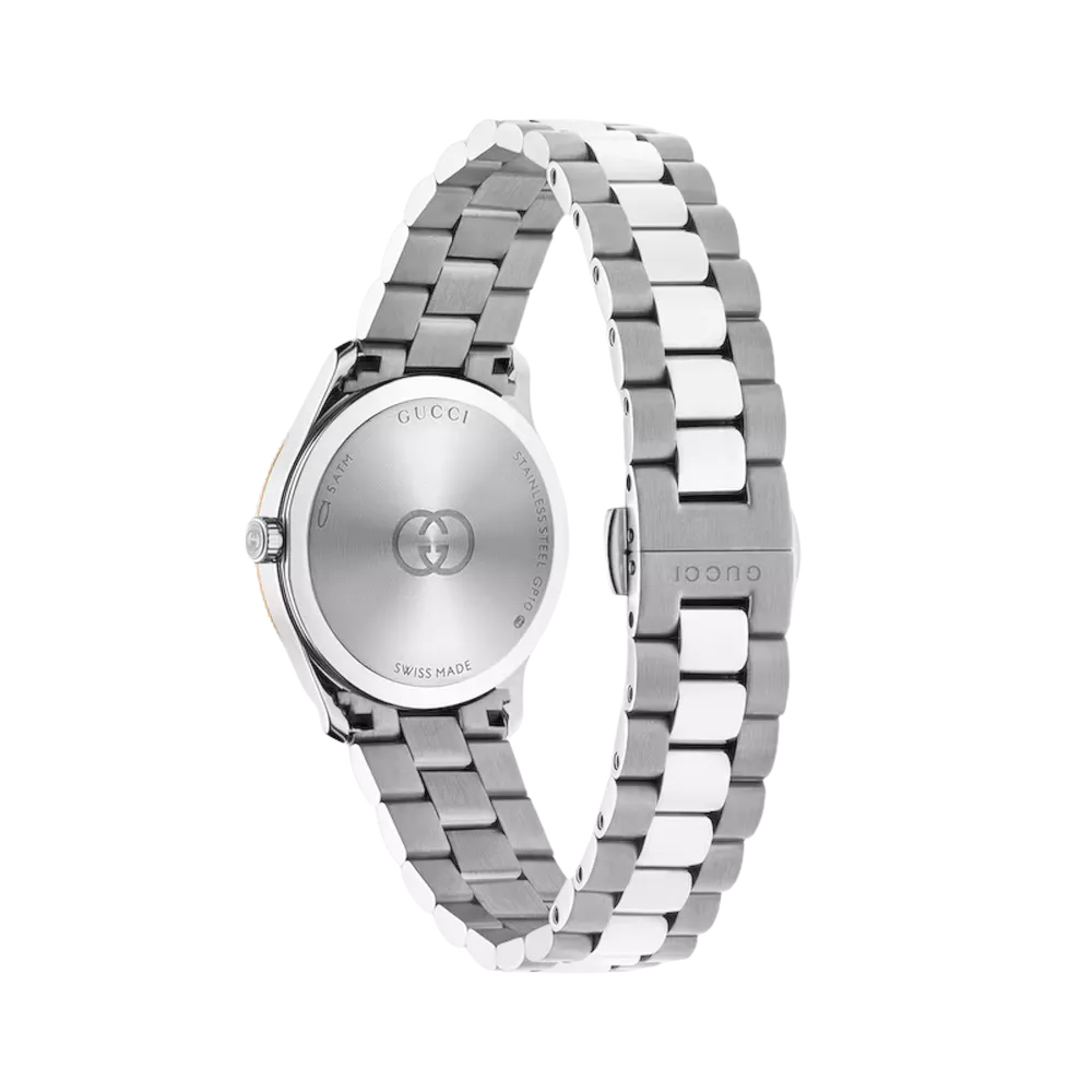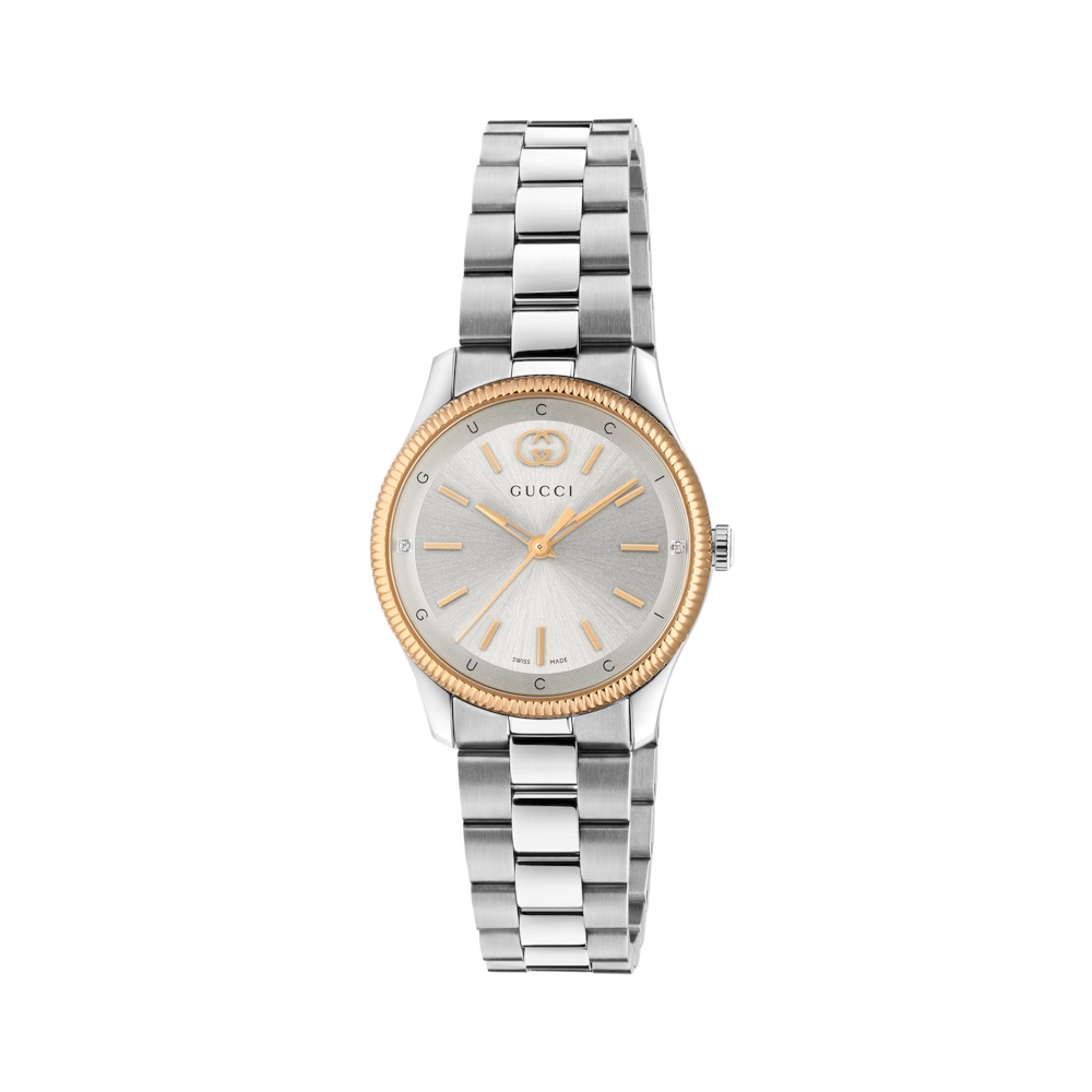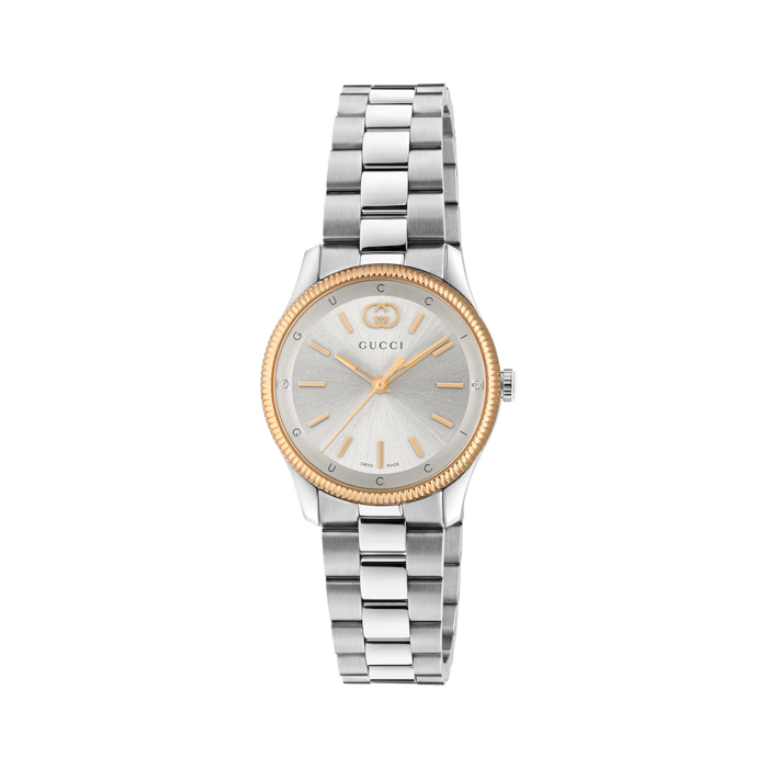For the latest collections, the G-Timeless line is reimagined in a vibrant color palette that highlights the Maison’s signature motifs. Featuring a stainless steel bracelet, this watch comes with a silver dial and a rose gold-toned bezel.