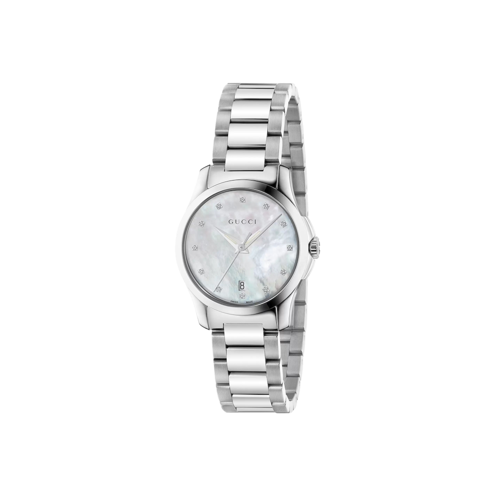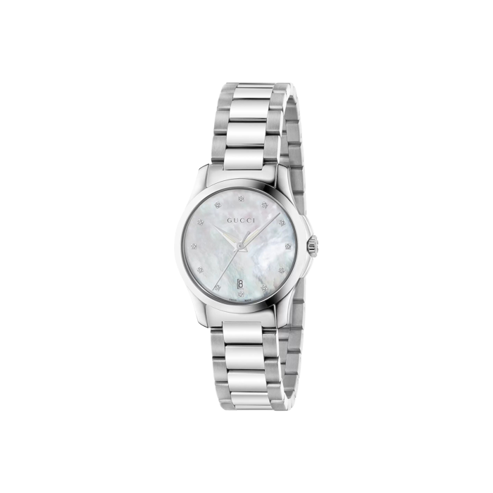 Watch from the G-Timeless collection stands out for many details that make it unique and inimitable. The 27 mm diameter stainless steel case makes the watch perfect for the wrist of women looking for a small and "fancy" watch. The dial, in white mother of pearl, is embellished with 12 diamonds, obviously used as indexes. The hands are silver-colored, but are still easily readable even on an important dial like this one of the Gucci Watches G-Timeless YA126542. The bracelet is instead in stainless steel with a 3-element folding clasp. Practical, functional and perfectly in line with the latest trends in watchmaking.