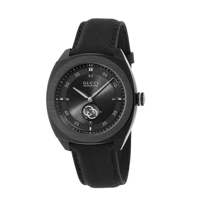 41 mm stainless steel case with black pvd coating, black PVD bezel, black dial, rubber strap with textile effect, self-winding movement