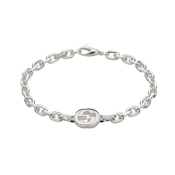 Inspired by the summer spirit and beach clubs of the Italian coast, this item is part of the Gucci Lido line. The Incrocio GG motif is reinterpreted in a contemporary key on new double band rings and thick hoop earrings. Soft chain bracelets and necklaces are embellished with the motif in the form of a logo detail. This bracelet, with lobster clasp, features the cut-out version detail.