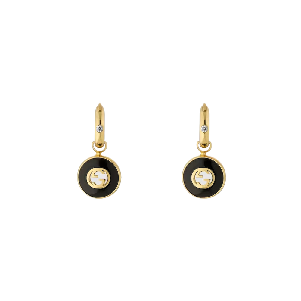 The Incrocio GG logo is presented in new and elegant versions for the Pre-Fall 2024 collection. The precious black onyx stone is combined with 18k yellow gold and embellished with diamonds. These hoop earrings can be worn with other accessories from the same line.