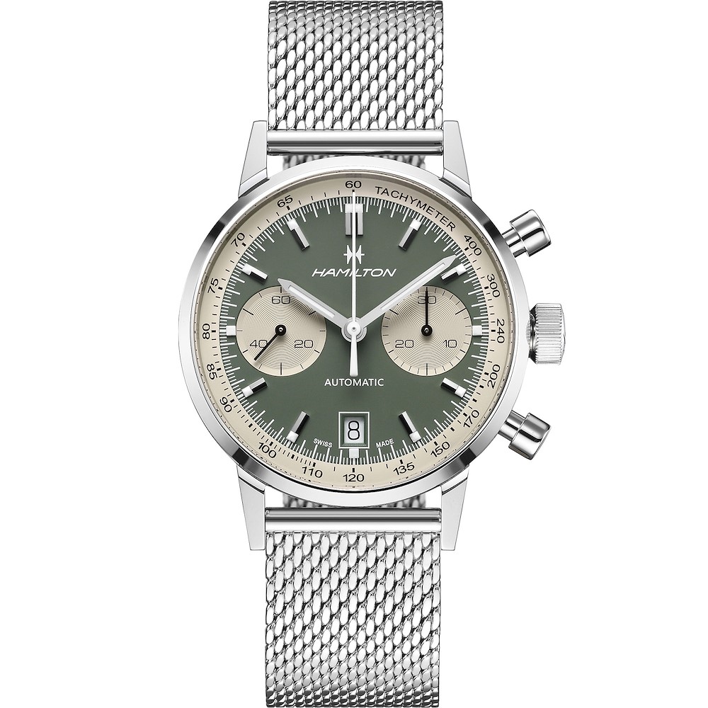 Il nuovo Hamilton Intra-Matic Automatic Chronograph è un connubio di sportività e vintage: uno stile che saprà catturare l’attenzione. Rivisitazione moderna di un pezzo iconico datato 1968, presenta il caratteristico quadrante effetto “panda” in un nuovo abbinamento bianco e verde chiaro. Che tu scelga la versione bracciale maglia milano o il cinturino in pelle marrone, il tuo stile sarà sempre inimitabile.