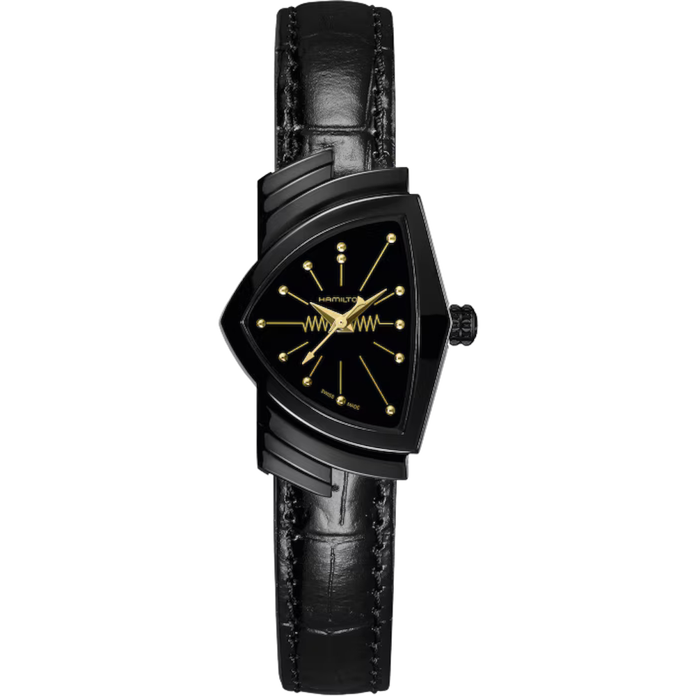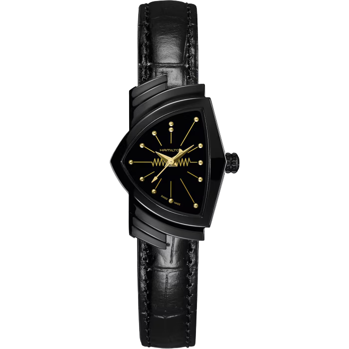 This new two-tone collection is a tribute to Hollywood glamour. It is a black&gold reinterpretation of 5 iconic Hamilton models: Jazzmaster Auto 36 mm, Jazzmaster Auto Chrono 42 mm, Pan Europe, Ventura Chrono Quartz and Ventura S. Playing on color contrasts, this capsule collection is a clear reference to big screen.