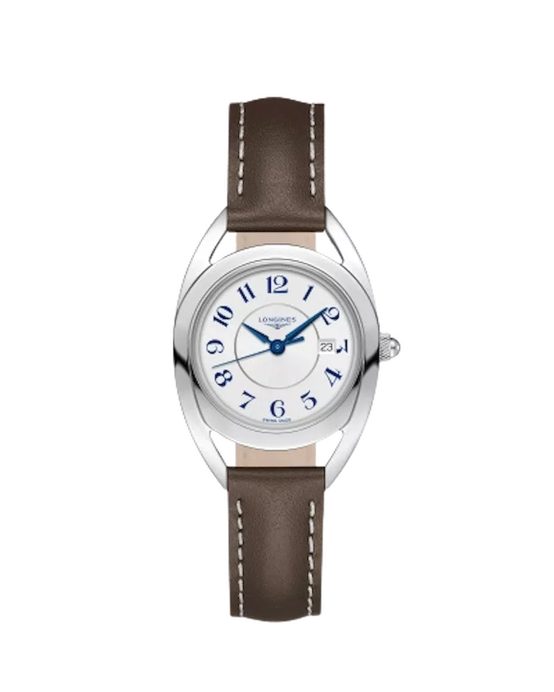 Part of the Longines Equestrian collection, this women’s watch features a stainless steel oval case inspired by a horseshoe design, measuring 30 mm in diameter with a solid caseback. A sapphire crystal protects the white dial with Arabic numerals and Alfa hands. Powered by the quartz Longines Caliber L152, it displays jumping hours and minutes, central seconds, and a date window. Water resistance is rated at 30 meters. Lug width is 14 mm. Reference: L6.137.4.73.2. Produced between 2016 and 2020, not a limited edition.