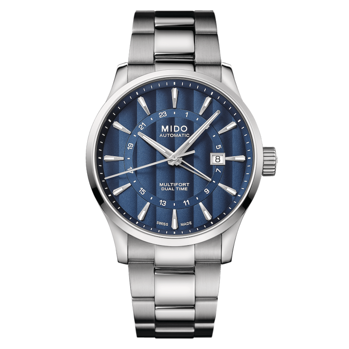 The Multifort GMT is a characterful Swiss watch equipped with a second time zone. The automatic timepiece has a sporty and timeless elegance appealing travellers and watch connoisseurs. While preserving the DNA of the Multifort collection, the aesthetic codes have been updated with wider Geneva stripes to deliver a pure design with excellent legibility.
