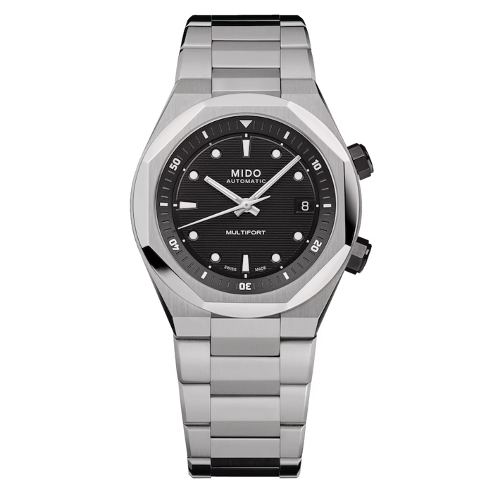 The boldness of the Multifort 8 Two Crowns changes the game! This visionary model, distinguished by its octagonal bezel, is enhanced by a horizontally embossed dial, while white Super-LumiNova® boosts the visibility of the indexes. This striking timepiece reinvents watchmaking codes by creating a new dimension: TECHNOMETRY — the perfect synthesis of TECHNOLOGY and GEOMETRY. It features an internal rotating rehaut, operated by a crown at 2 o’clock, while the time and date are adjusted via the crown at 4 o’clock. At its core is the Caliber 72 with Nivachron™ technology, a movement specifically selected for its slim profile and outstanding reliability — built to face the everyday challenges of today and tomorrow.