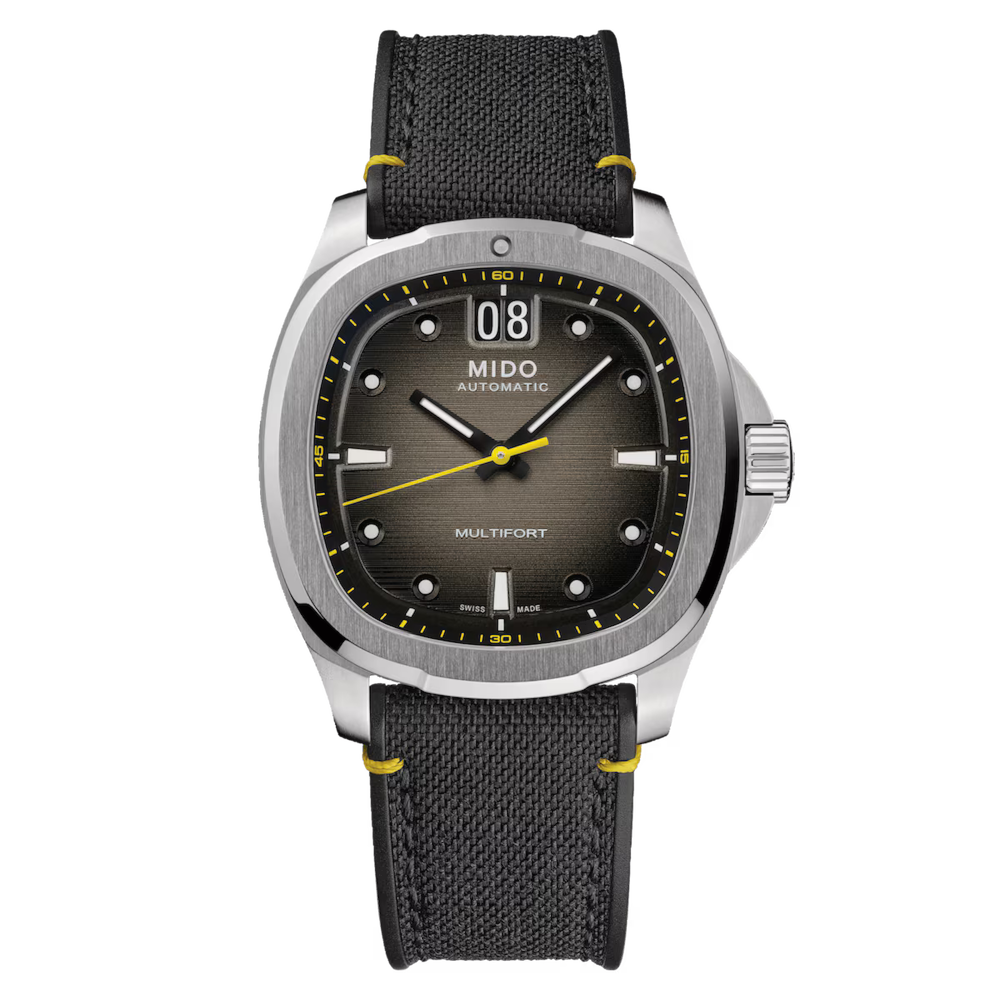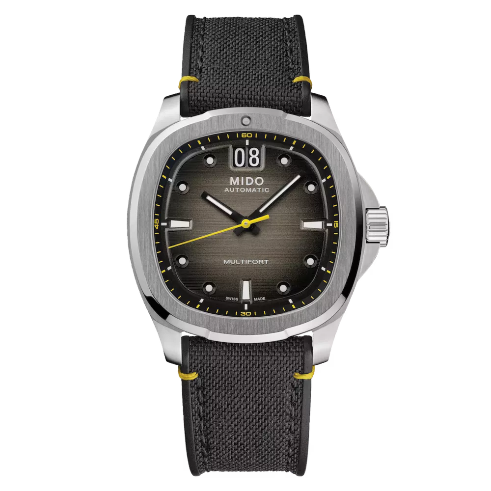 A brilliant comeback! Born of MIDO's extraordinary heritage, the TV-shaped case returns to center stage for the Multifort TV Big Date, as intense as it is precise, thanks to its formidable mechanical movement. The modern and dynamic design of this Swiss watch is underscored by a striking horizontal brushed dial and its distinctive feature: the BIG DATE inscription at 12 o'clock. Its formidable latest-generation automatic movement, Calibre 80, is equipped with a high-tech Nivachron™ balance spring that offers exceptional resistance to shocks and magnetic fields.