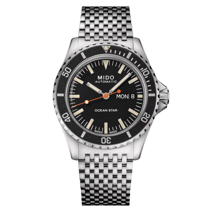 Mido pays tribute to the Ocean Star collection on its 75th anniversary. Inspired by the past, the Ocean Star Tribute reinterprets the aesthetic codes of 1960s diving models, bringing back all their distinctive features. It is equipped with an automatic Caliber 80 movement, water-resistant up to 20 bar (200 meters), and features an exclusive bracelet that ensures absolute comfort.