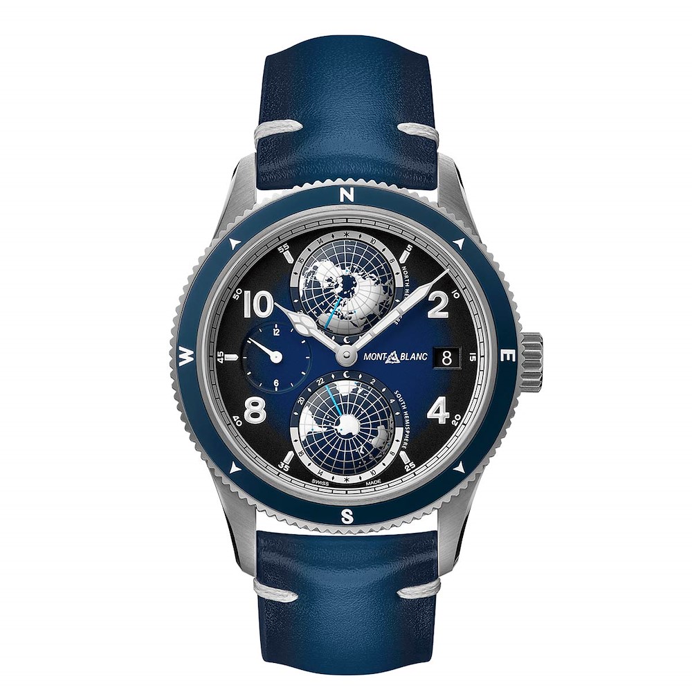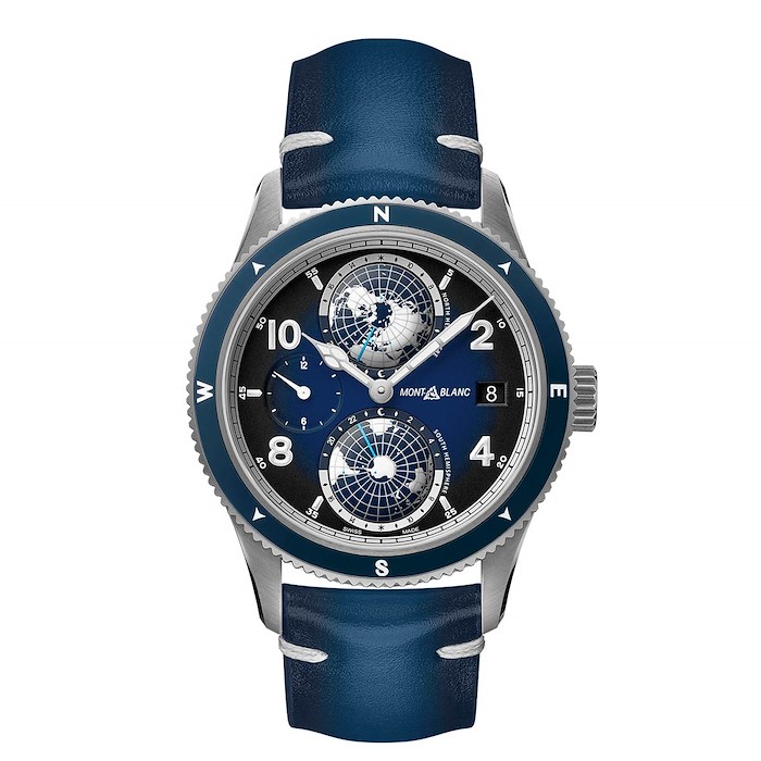 La linea Montblanc 1858 trae ispirazione dai leggendari orologi professionali Minerva degli anni ‘20 e ‘30, ideati per un uso militare e per le esplorazioni. La linea Montblanc 1858 reinterpreta questi segnatempo leggendari ed esprime lo spirito delle escursioni alpine, incarnando la tendenza moderna del ritorno alla natura. Il Montblanc 1858 Geosphere è dedicato alla sfida mondiale di alpinismo “Seven Summits”, il “Sacro Graal” delle escursioni in montagna. La cassa in titanio di 42 mm presenta dettagli blu a contrasto con elementi color ghiaccio, che traggono ispirazione dai colori dei ghiacciai. Il segnatempo è dotato di una complicazione dell’ora universale di manifattura, sviluppata dagli orologiai Montblanc di Villeret: due globi bombati che ruotano in direzioni opposte compiendo un’evoluzione completa in 24 ore. Entrambi sono circondati da una scala con i 24 fusi orari, insieme a un’indicazione giorno/notte con colori a contrasto che consente di apprezzare al meglio i vari fusi orari, grazie anche alla SuperLumiNova® applicata ai continenti, che garantisce maggiore visibilità e migliori prestazioni al buio. Il segnatempo è completato da un cinturino in pelle di vitello blu Sfumato con impunture bianche.