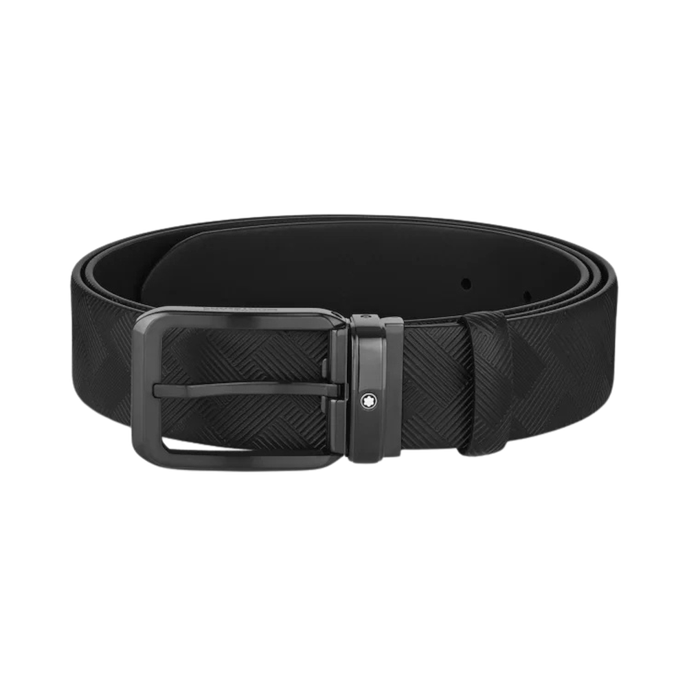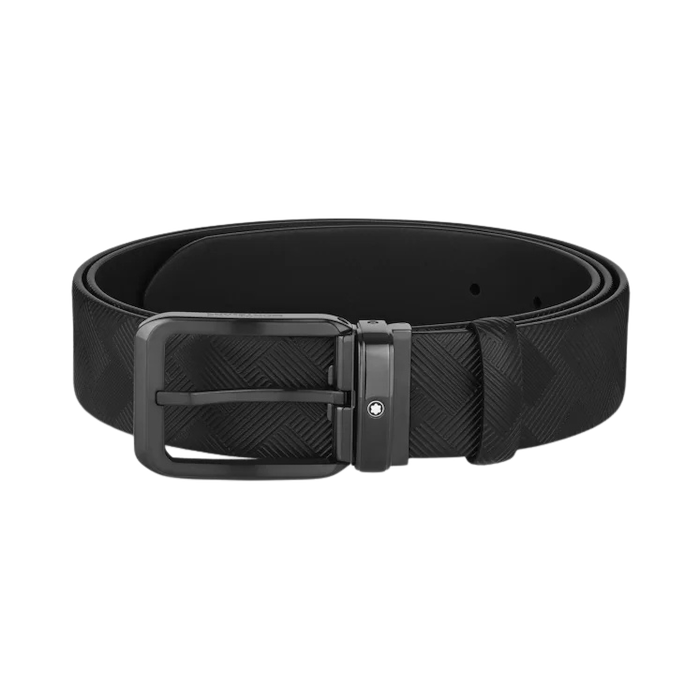 Rounded rectangular pin buckle in polished stainless steel with matt black PVD finish. Self-adjusting belt, 3.5 x 120 cm, reversible in black stamped leather with Montblanc Extreme 3.0 pattern on one side and black smooth leather on the other. Designed for a sporty look.