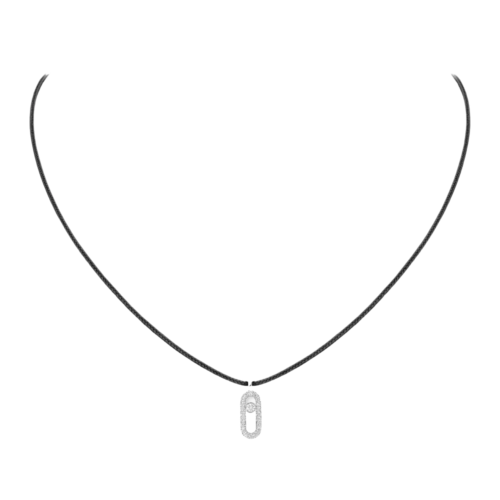 The MESSIKA CARE(s) diamond necklace reimagines the iconic Move Uno motif in a refined version crafted in white gold and diamonds, set on a black cord. Easy to wear, the adjustable cord allows for a custom fit with a simple gesture.