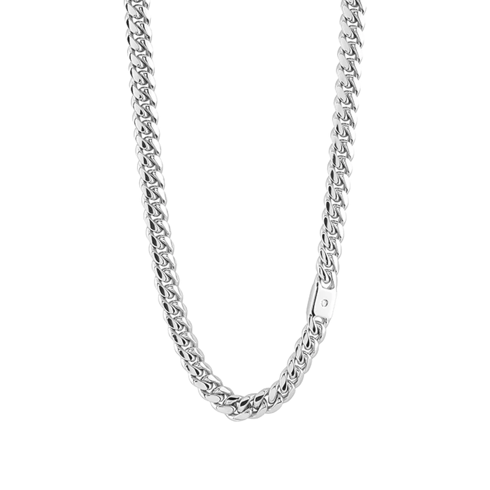 The Salvini necklace from the Equilibrio collection, product code 20111352, is crafted in silver with a weight of 32.5 g and embellished with round-cut diamonds. It features a length of 50 cm and a total diamond weight of 0.01 ct, with GH color. This piece is a new addition to the collection and is presented with a dedicated folder, offering a balanced and refined design ideal for enhancing any style.