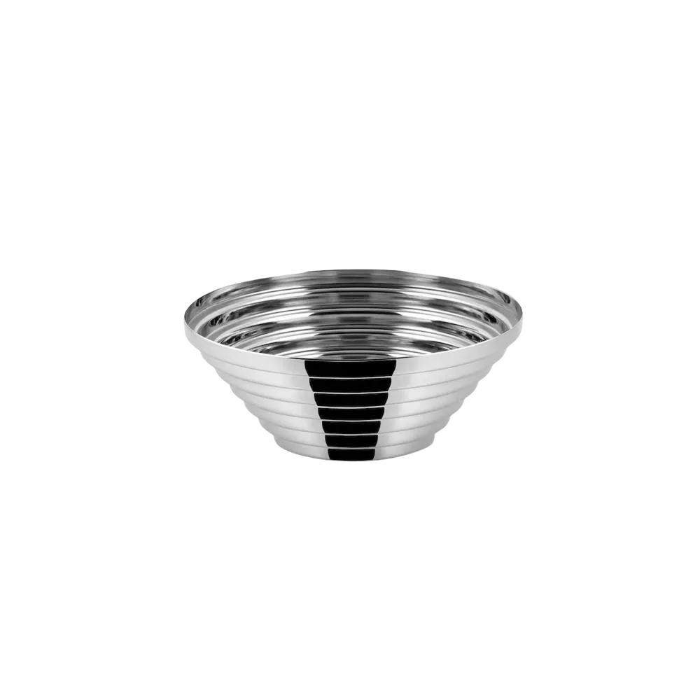 The Alessi Maya 7320/25 round basket is an iconic centrepiece in polished 18/10 stainless steel with a diameter of 25 cm, characterised by a minimalist design enhanced by refined plays of light and reflections. Designed by Giulio Confalonieri in the 1970s, it originated as a three-dimensional graphic design realised through the cold-forming of a steel sheet. Reissued in the Alessi Archive collection, it is available in the original polished finish and in colour variations that shift between green and purple, offering a dynamic effect that changes depending on the angle of view. Designed for those who love Italian design, it combines everyday functionality with timeless elegance, making it a sophisticated gift idea.