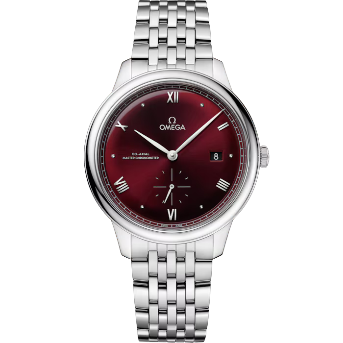 In this 41 mm stainless steel model, the domed PVD wine-burgundy dial features a sun-brushed finish. The display is distinguished by rhodium-plated hands, as well as alternating Roman numerals and cabochon indexes.