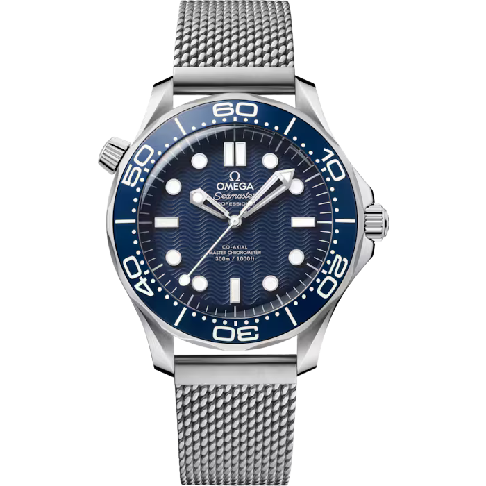 Launched in 2022 to mark James Bond's 60th anniversary and inspired by the original Seamaster Diver 300M worn by the British secret agent in the 1995 film GoldenEye, this 42mm stainless steel Seamaster Diver 300M features a blue anodized aluminum dial with a laser-engraved wave pattern. The commemorative number 60 replaces the traditional inverted triangle in the graduated scale.