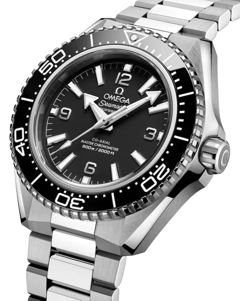 The Omega Seamaster Planet Ocean, ref. 217.30.42.21.01.001, combines diving heritage, innovation, and style. The 42 mm stainless steel case, with a 47.5 mm lug-to-lug distance and 13.79 mm thickness, features a black ceramic bezel with enamel scale and a Grade 5 titanium inner ring. The matte black dial has rhodium-plated hands and indexes with white Super-LumiNova, including four rhodium-plated Arabic numerals. Powered by the automatic Co-Axial Master Chronometer 8912 calibre with a 60-hour power reserve. The polished and brushed steel bracelet includes an adjustable folding clasp with diving extension; titanium screw-down caseback with hippocampus emblem. Water-resistant up to 60 bar (600 m), flat anti-reflective sapphire crystal, weight 177 g.