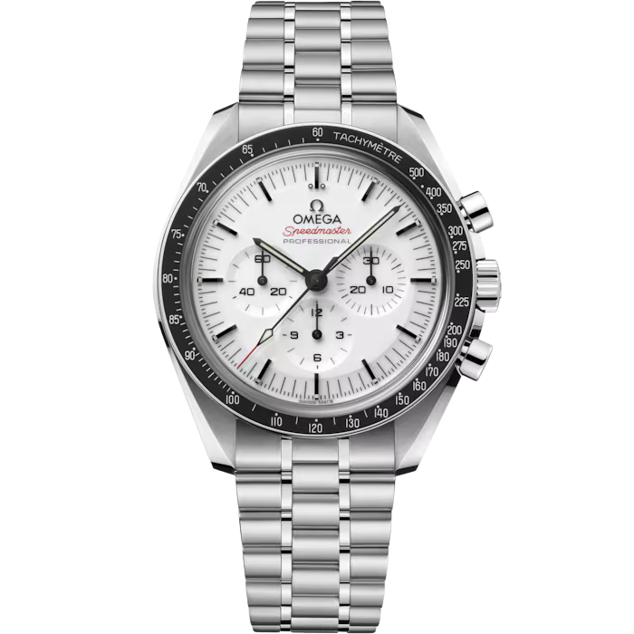Presented on a polished and brushed bracelet, this 42 mm stainless steel Moonwatch features a sapphire crystal dial and caseback. Inspired by the 4th generation Speedmaster worn on the moon, the model also features an asymmetrical case, a white lacquered dial with applied indexes and OMEGA logo, “Moonwatch” hands, and the famous “Dot over 90” index on the black anodized aluminium bezel ring.